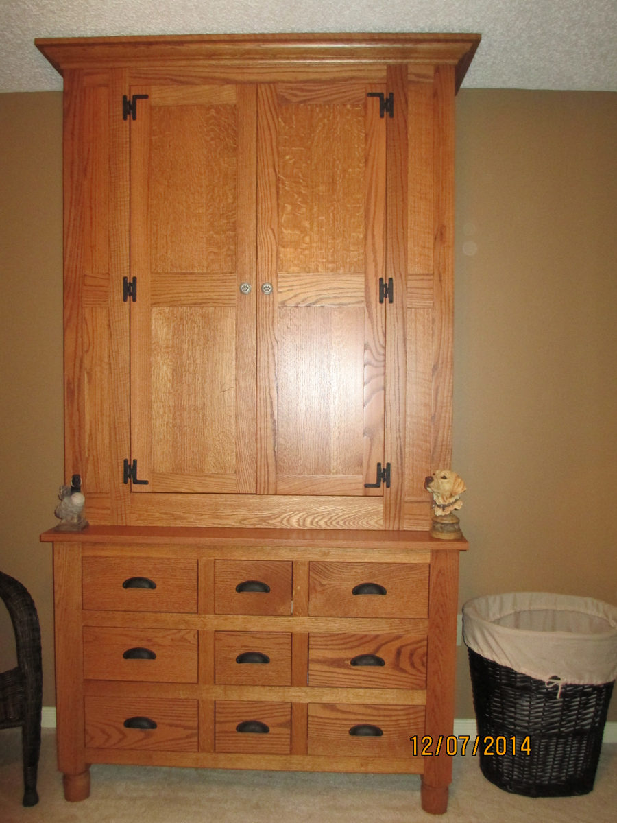Fully handcrafted ΒΌ sawn oak armoire with shaker doors and hand forged iron hinges